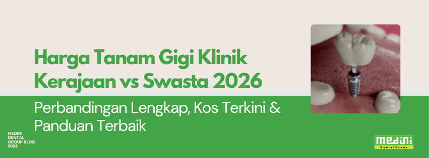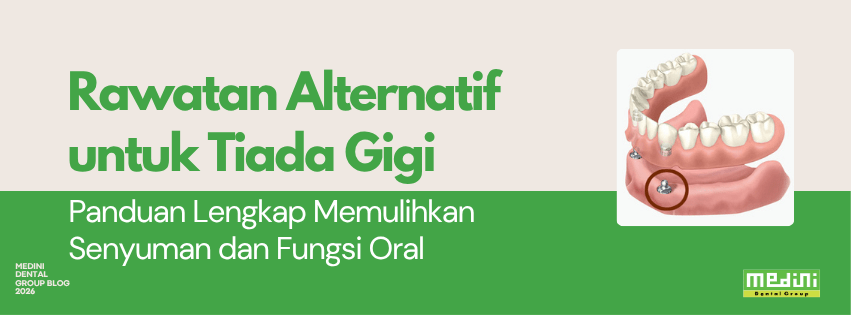 medini dental2026-03-25T06:25:18+00:00Rawatan Alternatif untuk Tiada Gigi: Panduan Lengkap Memulihkan Senyuman dan Fungsi Oral Kehilangan gigi bukan sahaja menjejaskan penampilan, malah memberi kesan besar kepada fungsi harian seperti mengunyah, bertutur, dan keyakinan diri. Dalam artikel ini, kami menghimpunkan rawatan alternatif untuk tiada gigi yang paling efektif, moden, dan terbukti untuk membantu individu mendapatkan semula kualiti hidup yang optimum. Setiap pilihan rawatan diterangkan secara terperinci agar pembaca dapat membuat keputusan yang tepat berdasarkan keperluan dan bajet masing-masing. Punca Utama Kehilangan Gigi yang Perlu Diketahui Kehilangan gigi berlaku akibat pelbagai faktor yang sering diabaikan. Antara punca utama termasuk: Penyakit gusi (periodontitis) yang merosakkan [...]